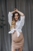 Modelka na fotografii měří 175 cm, obvod břicha v nejširším místě je 105 cm.
