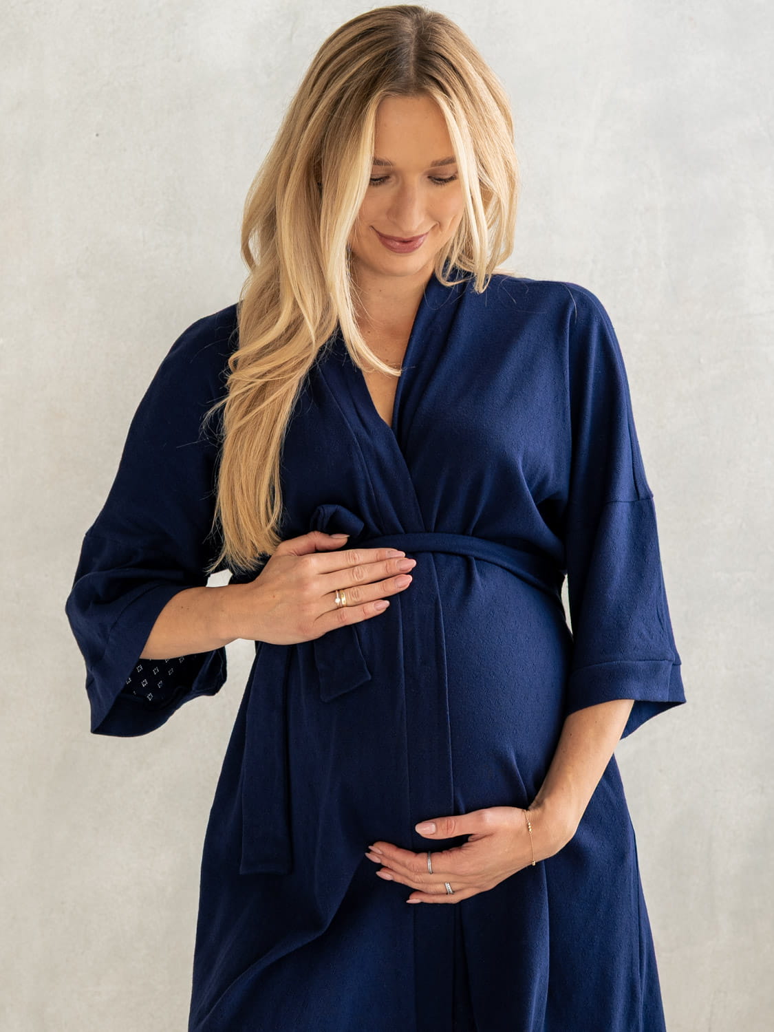 Těhotenský kimonový župan. Vytvořen tak, aby vás provázel od začátku těhotenství ještě dlouho po narození vašeho děťátka. Funkčnost a pohodlí jsou jeho hlavními vlastnostmi. Volný střih a velký rozsah nastavení se snadno přizpůsobí vašemu rostoucímu bříšku a pak už ho budete používat navždy.