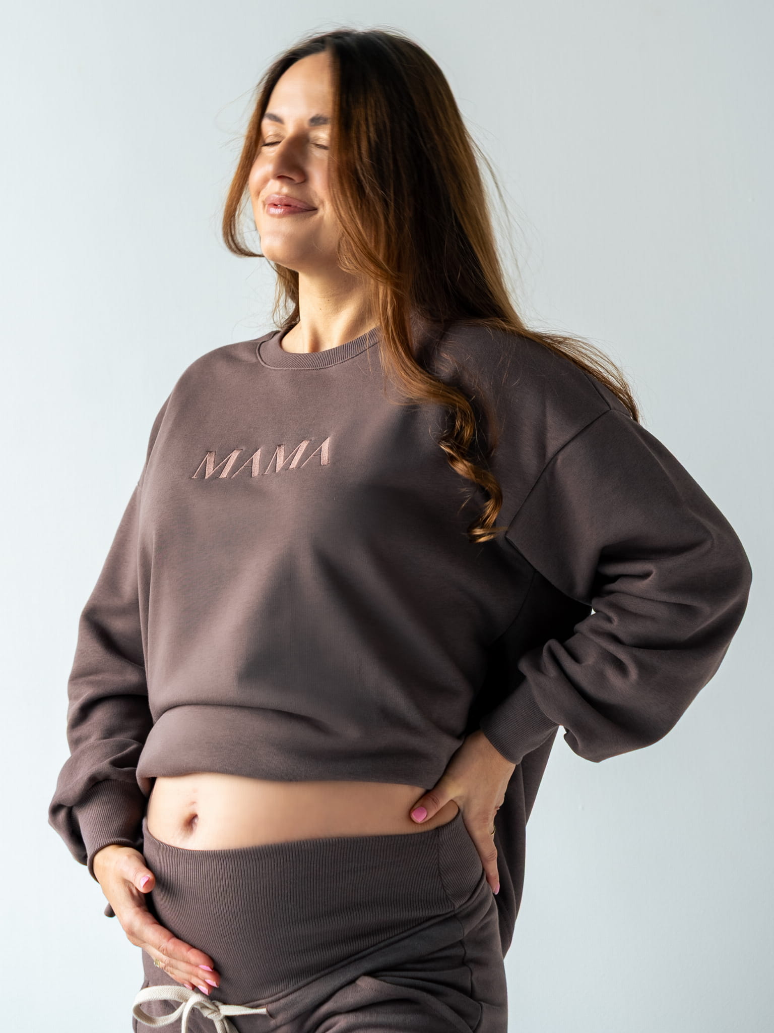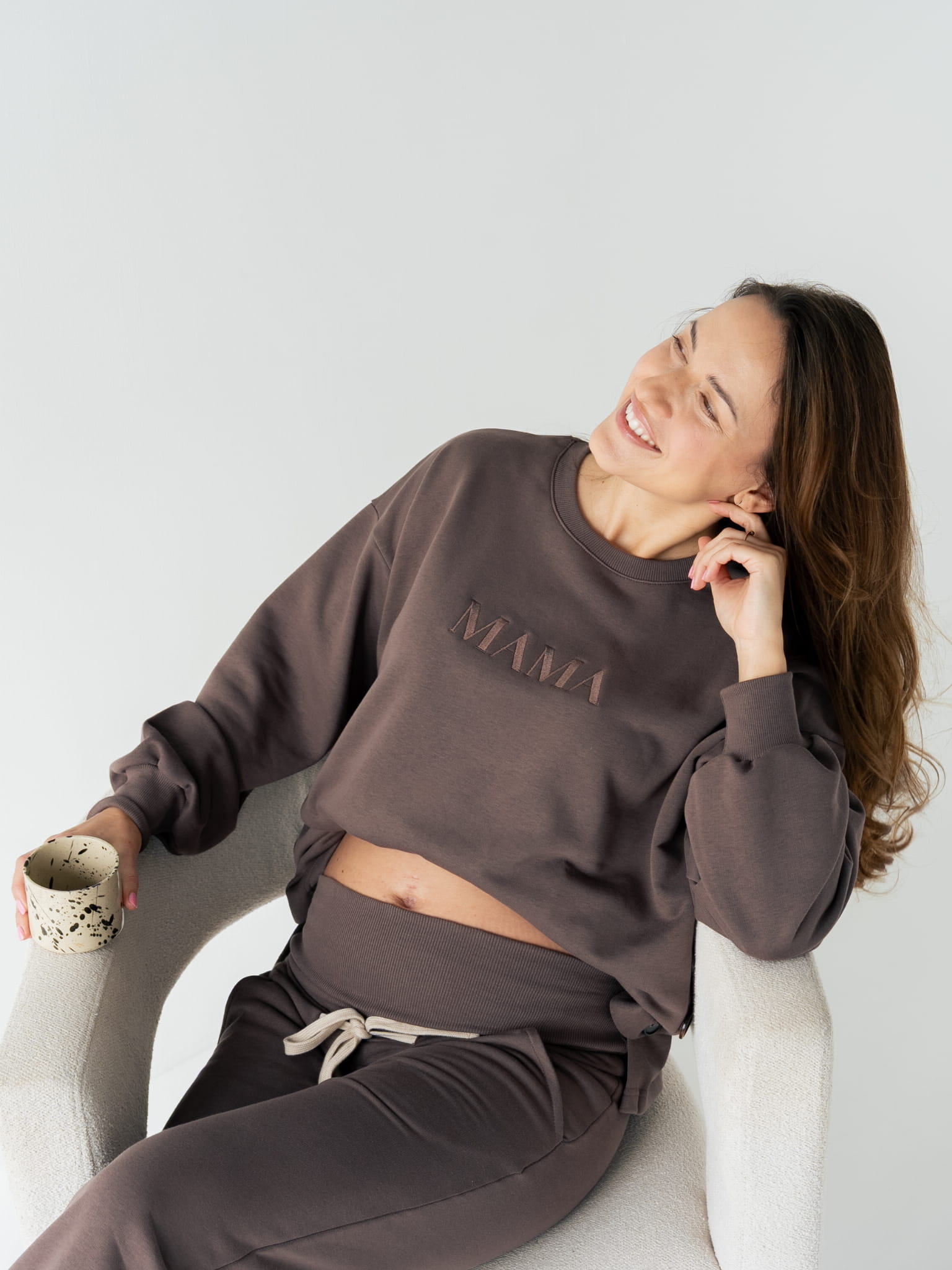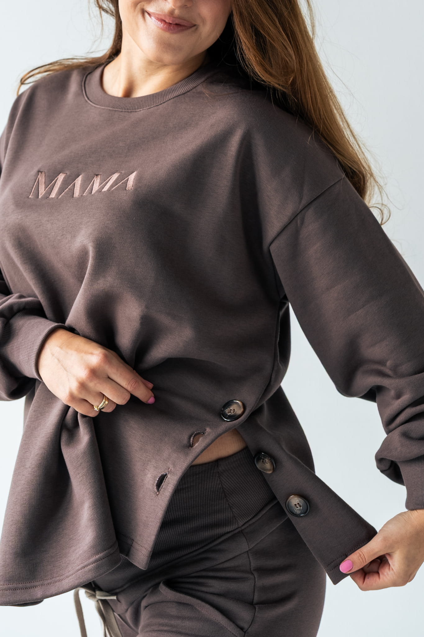 Bluza ciążowa i do karmienia piersią w kolorze czekolady to ubranie stworzone z miłości do komfortu, macierzyństwa i kobiecego ciepła. Uszyta lokalnie w Polsce, z wyjątkowo miękkiej dzianiny, otula rosnący brzuszek i towarzyszy mamie przez całą ciążę oraz podczas karmienia piersią. To bluza, która rośnie razem z Tobą, a później dyskretnie dba o wygodę i intymność podczas karmienia maluszka.