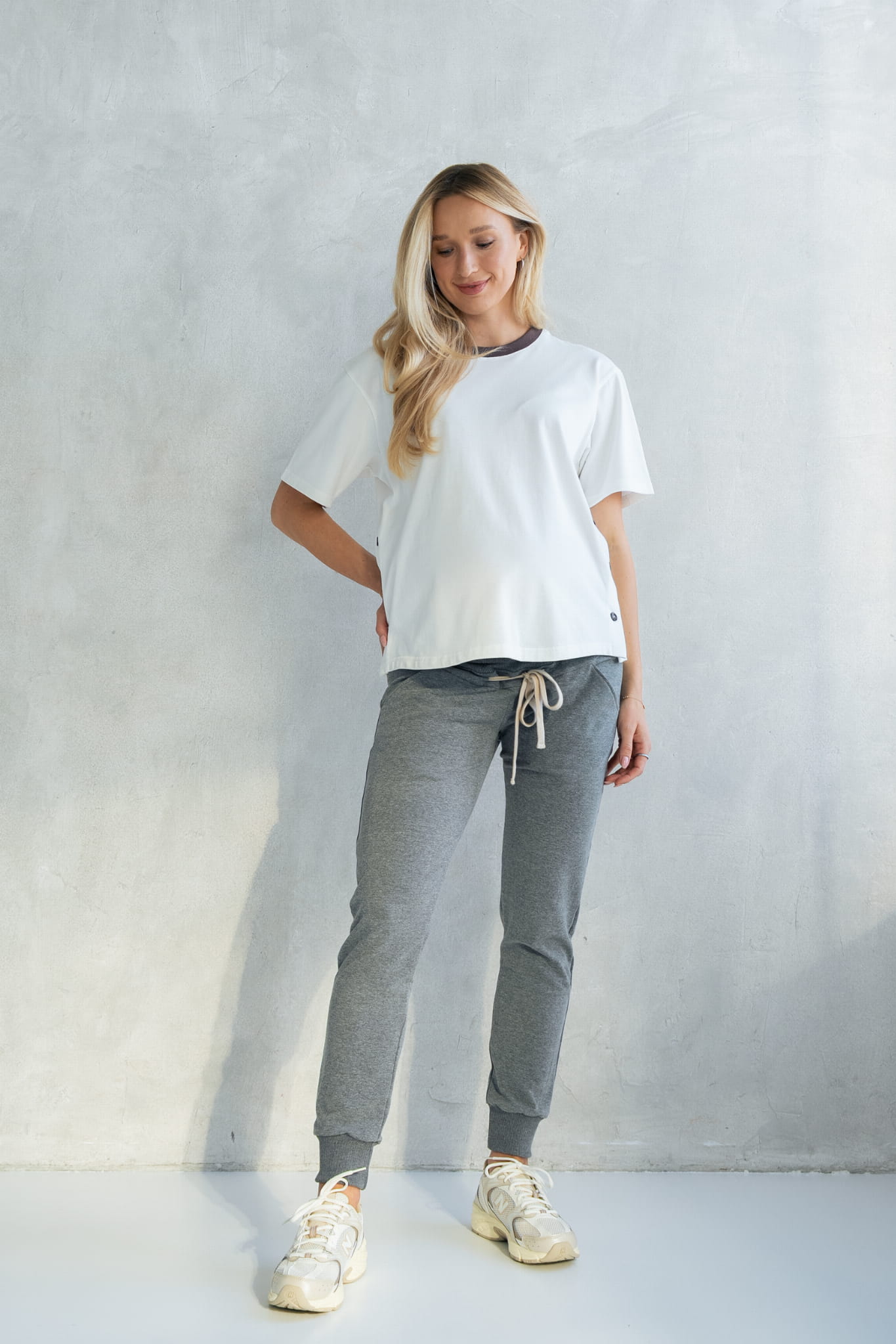 T-shirt ciążowy i do karmienia MACCIATO w kolorze subtelnej, kremowej bieli z kontrastującym ściągaczem przy szyi w kolorze czekolady, to ubranie stworzone z miłości do prostoty, macierzyństwa i kobiecego piękna. Uszyty w Polsce z miękkiej, oddychającej dzianiny bawełnianej, towarzyszy przyszłej mamie od pierwszych miesięcy ciąży aż po czas karmienia piersią. Jego lekko lejący materiał delikatnie dopasowuje się do rosnącego brzuszka, a po porodzie – pozwala na wygodne i dyskretne karmienie dzięki rozpinanym bokom na guziki.